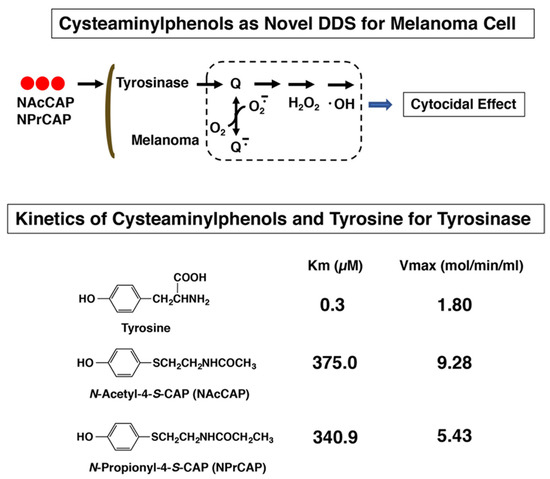 Tyrosine analogs that are the substrates of the melanin-forming enzyme tyrosinase can be some of the best candidates for developing specific melanoma-targeting drugs and therapies. N-acetyl and N-propionyl derivatives of 4-S-cysteaminylphenol (NAc- and NPr-CAP) were synthesized and found to be much better substrates of tyrosinase than tyrosine (Figure 1) [5].