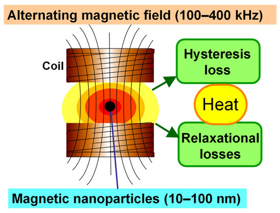 Hyperthermia provides a promising approach for cancer treatment. In particular, photothermal therapy and magnetic hyperthermia have been extensively studied in scientific research laboratories [6]. In photothermal therapy, a laser is used to irradiate the tumor lesions, and the optical energy can be converted into heat by photothermal conversion agents such as indocyanine green [7], IR820 [8], or gold nanoparticles [9]. Intracellular hyperthermia using magnetite nanoparticles (MNP) (10–100 nm-sized, Fe3O4) has been shown to be effective in treating cancers [10,11]. Incorporated MNP generate heat within the cells after exposure to an alternating magnetic field (AMF), due to hysteresis loss [12,13,14,15] (Figure 2). Compared with other heating systems such as photothermal therapy, magnetic hyperthermia is advantageous because a magnetic field can penetrate deep into the body tissues and has almost no interactions with biological molecules. In this treatment, there is not only heat-mediated cell death but also an immune reaction due to the generation of heat shock proteins (HSPs) [16]. HSP expression induced by hyperthermia has been found to be involved in cancer immunomodulation, providing the basis for developing a novel cancer thermo-immunotherapy.