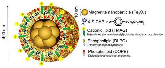 CTI therapy is based on the combination of chemotherapy using melanogenesis substrates and hyperthermia using magnetic nanoparticles, and the resulting antitumor immune response induced by in situ vaccination through dying tumor cells. Analogs of the melanogenesis substrate tyrosine are good candidates, such as the sulfur homolog of tyrosine 4-S-cysteaminylphenol (4-S-CAP), which causes cytotoxicity of melanoma [17,18] and can be used for melanoma-targeted chemotherapy. In addition, intracellular hyperthermia can be generated by loading magnetic nanoparticles into tumor cells followed by inductive heating of the nanoparticles under an alternating magnetic field (AMF). A promising approach of the initial step to improve uptake of nanoparticles into tumor cells was to use cationic liposomes. We developed magnetite cationic liposomes (MCLs) that have 10-fold higher affinity for tumor cells than neutrally charged magnetite liposomes [19]. To test the combined effects of chemotherapy using 4-S-CAP and hyperthermia using MNP on melanoma, we prepared 4-S-CAP-loaded magnetite cationic liposomes (4-S-CAP/MCLs) (Figure 3) [20].