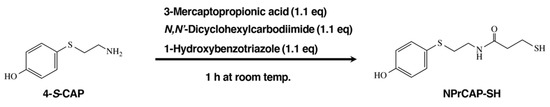 Obtained by hydrolyzing N-acetyl-4-S-CAP (NAcCAP) with 6 M HCl by the method of Padgette et al. [23], 4-S-CAP was reacted with 3-mercaptopropionic acid, N,N’-dicyclohexylcarbodiimide and 1-hydroxybenzotriazole in N,N-dimethylformamide for 1 h at room temperature. The resultant oily compound was purified by silica gel column chromatography to give NPrCAP-SH (90%) as a colorless crystal after recrystallization (ethyl acetate-ether). Thus, we have established an efficient and reproducible one-pot method for the synthesis of NPrCAP-SH (Figure 4).