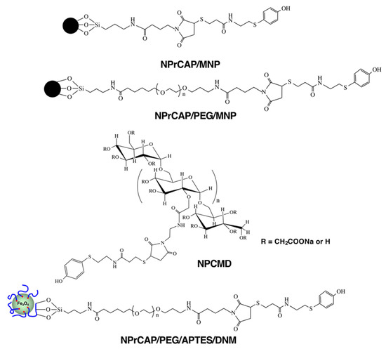 We synthesized four NPrCAP derivatives bound to MNP as shown in Figure 5 for CTI therapy, and we have already reported the synthetic methods for three of these derivatives (NPrCAP/MNP, NPrCAP/PEG/MNP and NPCMD) [8,24,25,26]. In this review, we report a new method for the synthesis of NPrCAP/PEG/APTES/DNM, which is described below.