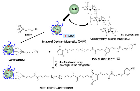 Dextran nanomagnetite (DNM) was prepared by adding dextran in water to a magnetite suspension. DNM thus prepared was first reacted with 3-aminopropyltriethoxysilane (APTES) to form APTES/DNM, and then with PEG-NPrCAP obtained by reacting NPrCAP-SH and PEG for 1 h at room temperature. The mixture was kept for 4 to 6 h at room temperature, and then kept in a refrigerator overnight to synthesize NPrCAP/PEG/APTES/DNM (Figure 6).