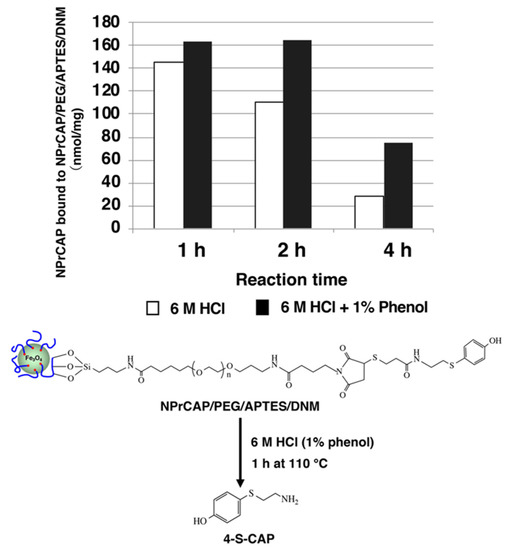 In order to quantify the amount of NPrCAP bound to DNM, 6 M HCl with or without 1% phenol was added to the NPrCAP/PEG/APTES/DNM suspension and reacted for up to 4 h at 110 °C to produce 4-S-CAP. When hydrolyzed with 6 M HCl in the absence of phenol, the amount of 4-S-CAP yielded after 4 h was reduced to 20% of the amount yielded after 1 h (Figure 7). The reduction was considered to be due to the decomposition of 4-S-CAP during HCl hydrolysis. On the other hand, the inclusion of 1% phenol in 6 M HCl suppressed the decomposition of 4-S-CAP, which did not decompose even with 2 h reaction time. Based on the above results, the following experimental conditions to check the amount of NPrCAP bound to NPrCAP/PEG/APTES/DNM were established: (1) the NPrCAP/PEG/APTES/DNM suspension is reacted under 6 M HCl containing 1% phenol for 1 h, and (2) the reaction mixture is diluted 10-fold with 0.1M HCl and then 4-S-CAP is quantified by high-performance liquid chromatography (HPLC) analysis (Figure 7).