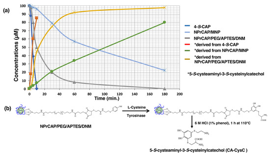 We examined whether NPrCAP/MNP and NPrCAP/PEG/APTES/DNM could act as substrates for tyrosinase; 4-S-CAP itself was found to be a good substrate for tyrosinase because tyrosinase oxidation of 4-S-CAP in the presence of cysteine yielded 5-S-cysteaminyl-3-S-cysteinylcatechol (CA-CysC) through ortho-quinone within 10 min (Figure 8a) [8,27,28]. HPLC analysis showed that the reaction was almost completed within 10 min, with half of the 4-S-CAP remaining after 4.2 min [8,27]. HPLC analysis showed that CA-CysC derived from 4-S-CAP was produced at 85 µM (85% yield) at 10 min. The reaction rate constant (k) of 4-S-CAP was 0.17 min−1. As NPrCAP/MNP has the same structural units as 4-S-CAP, it was expected to be a substrate for tyrosinase. If this were the case, CA-CysC would be obtained by HCl hydrolysis, in the presence of 1% phenol, of the cysteinylcatechol derivative of NPrCAP/MNP produced after tyrosinase oxidation of NPrCAP/MNP in the presence of cysteine. NPrCAP/MNP fell to half of the initial concentration after 82 min, and CA-CysC produced after 180 min was 80 µM (80% yield) (Figure 8a). Thus, the ratio of 4-S-CAP to NPrCAP/MNP in the reaction velocity on tyrosinase oxidation was 19.5, and the reaction rate constant (k) of NPrCAP/MNP was 8.5 × 10−3 min−1. These results indicate that NPrCAP/MNP served as a substrate for tyrosinase. On the other hand, in the case of NPrCAP/PEG/APTES/DNM, the time for reduction to half of the initial concentration was 17 min, and the concentration of CA-CysC produced after 180 min was 98 µM (98% yield) (Figure 8a,b). The ratio of 4-S-CAP to NPrCAP/PEG/APTES/DNM in the reaction velocity on tyrosinase oxidation was 4.0, and the reaction rate constant (k) of NPrCAP/PEG/APTES/DNM was 4.1 × 10−2 min−1. Thus, the tyrosinase oxidation of NPrCAP/PEG/APTES/DNM was about five times faster than that of NPrCAP/MNP. This was predicted because (1) the dispersibility of NPrCAP/PEG/APTES/DNM is greater and (2) in NPrCAP/PEG/APTES/DNM, the side chain is longer, and the steric hindrance of the aromatic ring site was alleviated.