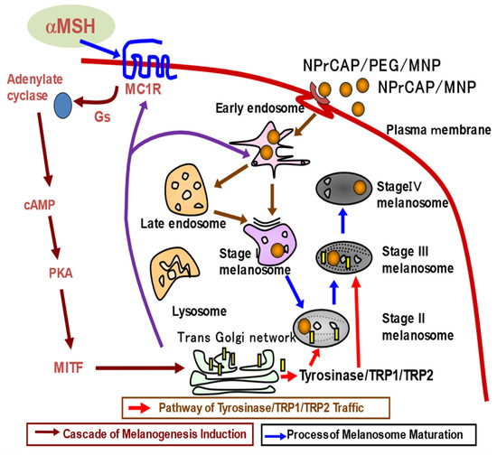 The biological property unique to melanoma cells and their precursor cells, melanocytes, is the biosynthesis of melanin pigments, melanogenesis, within specific cellular compartments called melanosomes. Melanogenesis begins with the conversion of amino acid tyrosine to 3,4-dihydroxyphenylalanine (dopa) and subsequently to dopa quinone in the presence of tyrosinase. This pathway is unique to all melanocytes and melanoma cells, including “amelanotic” melanoma [1]. With the interaction of melanocyte-stimulating hormone (MSH) and the melanocortin 1 receptor (MC1R) [2], the melanogenesis cascade proceeds with activation of microphthalmia transcription factor (MITF) for the induction of either eu- or pheomelanin biosynthesis. Tyrosinase is the major player of this cascade. It is a glycoprotein and its glycosylation process is regulated by a number of molecular chaperones, including calnexin, in the endoplasmic reticulum. Vesicular transport then carries tyrosinase and its related proteins (TRPs) from the trans-Golgi network to melanosomal compartments. A significant number of transporters in this process are involved in early melanosomal maturation, to which early and late endosomes are closely associated [3]. Once melanin biosynthesis is completed, melanosomes move along dendritic processes on melanocytes and are transferred to surrounding keratinocytes in skin. However, melanoma cells do not develop many dendrites and retain melanosomes within their cytoplasm, hence forming a “black mole” [4].