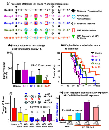 Tumor growth and survival of mice re-challenged with melanoma transplants after treatment of initial transplants; heat shock protein (HSP) expression in initial transplants. (a) Experimental protocols for the five groups of mice, all of which underwent initial B16F1 melanoma transplants on day 0, removal of the tumors on day 13, and re-challenge with B16F1 on the opposite flank on day 53. The Control group received no treatment, Group I received MNP without AMF on the days indicated, and Group II received MNP + AMF. Group III received NPrCAP/MNP without AMF, and Group IV received NPrCAP/MNP + AMF. (b) Volumes of re-challenge B16F1 tumors 14 days after transplantation (67 days after primary transplantation). (c) Kaplan–Meier survival curves after primary and re-challenge melanoma transplants. (d) Effects of AMF frequency and temperature on re-challenge B16F1 tumor volumes in mice treated with NPrCAP/MNP on days 6, 8 and 10 after primary tumor transplantation plus AMF on days 6 and 10 (blue inverted triangles) or on days 6, 8 and 10 (red inverted triangles). Tumor volumes were measured on day 67, 14 days after re-challenge transplantation. (e) HSP expression in primary B16F1 tumors treated with MNP or NPrCAP/MNP together with exposure to AMF at the indicated temperatures. ※ shows the significant differences between the control.