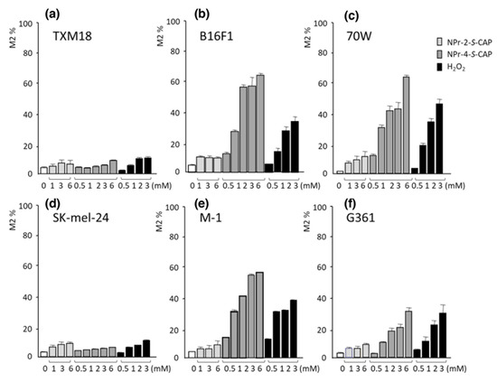 To analyze the relationship between NPrCAP-mediated apoptosis and ROS production in melanocytic cells, we examined ROS generation using flow cytometry. Pigmented and non-pigmented melanoma cells were cultured with the general ROS indicator CM-H2DCFDA (5 μM) for 30 min and then with NPrCAP (NPr-4-S-CAP) or the inactive NPr-2-S-CAP (0.5–6 mM) for 1 h. The cells were then collected and processed for flow cytometry to quantify the ROS-containing cell fraction M2 [10]. Pigmented B16F1, 70W, G361 and M-1 melanoma cells, but not non-pigmented TXM18 and SK-mel-24 melanoma cells, produced significant amounts of ROS in the presence of NPr-4-S-CAP (Figure 14). The results suggested that NPrCAP selectively produced ROS in pigmented melanoma cells and that melanin biosynthesis was essential for NPrCAP to produce ROS.