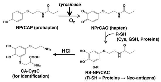 Based on the haptenation theory, Ito et al. examined the oxidation of NPrCAP and its subsequent binding to sulfhydryl compounds (thiols) [28]. They demonstrated that NPrCAP is oxidized by tyrosinase to form a highly reactive ortho-quinone (N-propionyl-4-S-cysteaminyl-1,2-benzoquinone, NPrCAQ; Figure 15), which binds covalently to biologically relevant thiols, including proteins through cysteine residues. The production and release of NPrCAQ-protein adducts was verified in B16F1 melanoma cells in vitro and in B16F1 melanoma-bearing mice in vivo through the detection of CA-CysC after acid hydrolysis of the protein fraction (Figure 15). These results suggested that the phenol NPrCAP, acting as a prohapten, can be oxidized in melanoma cells by tyrosinase to the active quinone-hapten NPrCAQ, which binds to melanosomal proteins through their cysteine residues to form possible neo-antigens, thus triggering the immunological response.
