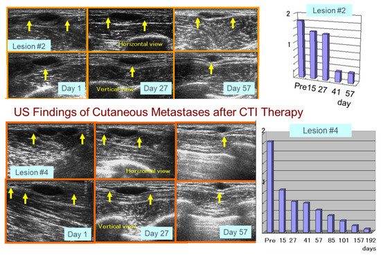 Ultrasound (US) findings of distant melanoma metastases after CTI therapy. Arrows in the photo indicate horizontal and vertical views of metastatic tumors comparing the decreased size of the tumor volume.