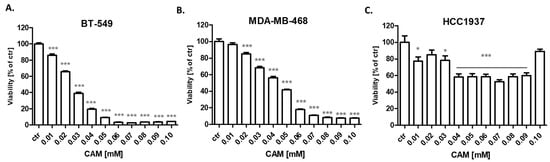 2.1. CAM and PAX Administered Alone or Combined Decrease Viability of BT-549 and MDA-MB-468 TNBC Cells