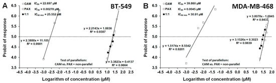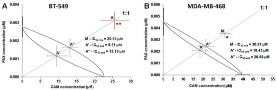 2.3. Isobolographic Analysis of Drug-Drug Pharmacological Interaction between CAM and PAX for Non-Parallel Concentration-Effect Curves in BT-549 and MDA-MB-468 TNBC Cells