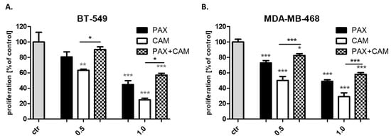 2.2. CAM and PAX Administered Alone or Combined Decrease Proliferation of BT-549, MDA-MB-468 and HCC1937 TNBC Cells
