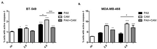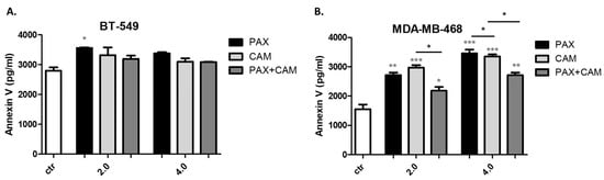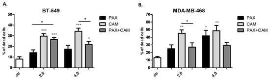 2.4. CAM and PAX Administered Individually Induce Cell Death, While the Administration in Combi-Nation Abolishes This Effect in BT-549 and MDA-MB-468 TNBC Cells