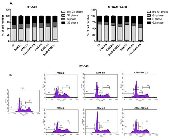 2.6. CAM and PAX Administered Singly and in Combination Induce Cell Cycle Arrest in the BT-549 and MDA-MB-468 BC Cells in a Cell-Dependent Manner