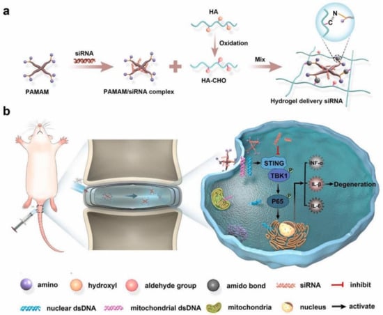 - Chen, J.; Zhu, H.; Zhu, Y.; Zhao, C.; Wang, S.; Zheng, Y.; Xie, Z.; Jin, Y.; Song, H.; Yang, L.; et al. Injectable self-healing hydrogel with siRNA delivery property for sustained STING silencing and enhanced therapy of intervertebral disc degeneration. Bioact. Mater. 2022, 9, 29–43. [Google Scholar] [CrossRef]