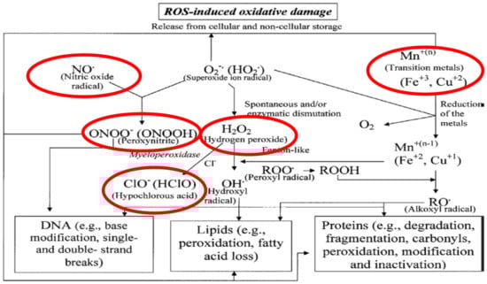 Kohen and Nyska in 2002, as shown in Figure 1, defined several species of ferric, manganese, and copper molecules, which serve as resident catalysts for RONS production, such as nitric oxide, hydrogen peroxide, peroxynitrite, hypochlorous acid, and perchlorate molecules, which damage DNA, lipids, and proteins [], especially when potentiated by high energy radiations (HZE), such as the case with GCR.