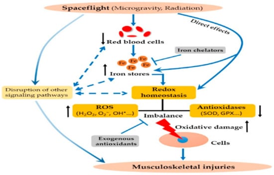 - Yang, J.; Zhang, G.; Dong, D.; Shang, P. Effects of iron overload and oxidative damage on the musculoskeletal system in the space environment: Data from spaceflights and ground-based simulation models. Int. J. Mol. Sci. 2018, 19, 2608. [Google Scholar] [CrossRef] [PubMed]
