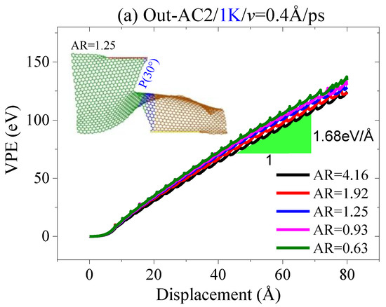 Second, the value of AR also has a slight influence on the path of crack propagation; Figure 11a indicates that the VPE curves have a slight gap and the slopes are about 1.68 eV/Å when tearing the sheet along the armchair crack, which expands along with the path of P(30°). When tearing the zigzag crack, the path of crack propagation is along P(0°). The inserted snapshots in Figure 11 demonstrate that the deformation of the sheet is very low in the out-of-plane tearing. Hence, stress concentration at the crack tip can be avoided. This is the reason why the curves in Figure 11 have slight gaps while the corresponding VPE curves in Figure 4 have obvious gaps, meaning that the lengths of the two confined areas in the graphene sheet can be set randomly in an out-of-plane tearing.