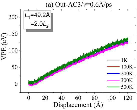 When more atoms are confined in tearing, e.g., L1 = 30.8 Å (In-AC2 in Figure 2a2) or L1 = 49.2 Å (In-AC3 in Figure 2a3), the gaps between the VPE curves are much smaller than those in In-AC1 (Figure 2a1). This implies that the loading speed has a slight influence on the path of crack propagation when more atoms at the edge are confined in tearing. However, the peak value of VPE is generally higher at faster loading speeds.