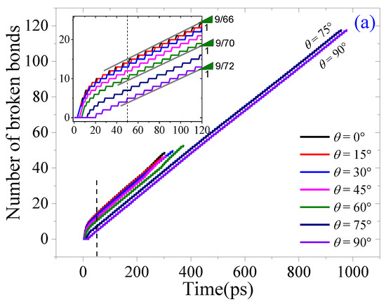 There are three types of tearing results. For example, when θ =75° or 90°, the crack always propagates along with the path P(0°) (Figure 13b). When θ < 75°, the path is first aligned with P(0°) for about 300 ps, and then changes to be aligned with P(−90°) (see the snapshots with θ = 0°, 45°, or 60° in Figure 13b), or a new crack appears at the end of the moving area (see the snapshots with θ = 15°, or 30° in Figure 13b). The sheet splits off by generating different numbers of broken bonds (Figure 13a). Hence, even when the sheet has a zigzag crack, the path of crack propagation predominantly depends on the loading direction. Note that a rectangular ribbon can be produced from a wider graphene sheet by the oblique tearing processes, where the crack path is along P(0°) at first, and then turns along P(−90°).