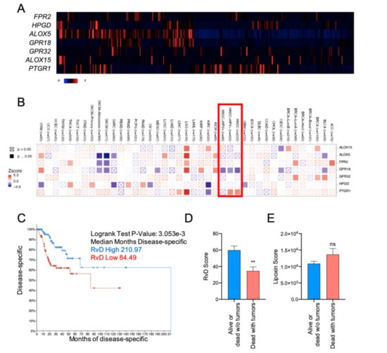 A higher RvD score is associated with more favorable outcomes in HNSC. (A) Heatmap of individual genes involved in SPM production in HNSC patients. mRNA expression z-scores relative to diploid samples (RNA Seq V2 RSEM) are shown. Patients are reported in columns, genes in rows. Blue: lower expression; red: higher expression. Color code is reported at the bottom of the panel. (B) Association between individual SPM genes and overall survival in multiple TCGA datasets. The heatmap (TIMER 2.0, Gene_Outcome mode) shows the normalized coefficient (z-score) of association between individual gene expression and overall survival (red: inverse association; blue: direct association) adjusted for age, gender, stage and purity. A red rectangle highlights HNSC cancers. Filled squares indicate significant (p < 0.05) associations predicted in multiple cancer types. TCGA study abbreviations were reported according to the NCI genomic data commons. (C) Kaplan–Meier curve survival analysis of HNSC patients stratified for high (n = 100) or low (n = 100) RvD score. Logrank test p-value and median months progression free are reported. (D) RvD score in HNSC from TCGA datasets in tumor-free alive or dead patients (n = 362) vs. patients’ death with symptoms of cancer (n = 128). Clinical data were extracted from the TCGA HNSC database using the cBioportal software. ** p < 0.01, Student t test. (E) Lipoxin score in HNSC from TCGA datasets in tumor-free alive or dead patients (n = 362) vs. patients dead with tumors (n = 128). Clinical data were extracted from the TCGA HNSC database using the cBioportal software. p = ns, Student t test.