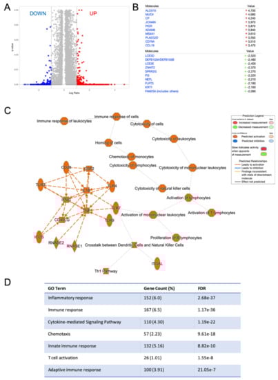 To investigate the transcriptional landscape of tumors with the higher RvD score, bulk RNA-seq data of RvD high and RvD low tumors were compared at a single-gene level to identify DEG among groups. This analysis identified 254 down- and 2304 up-regulated transcripts (q-value < 0.05, fold change cut off ±2) in the RvD high group (Figure 3A,B). In addition, the Ingenuity Pathway Analysis (IPA) software revealed that genes modulated in the RvD high score group were associated with major biological themes related to anti-tumor immunity, such as Th1 pathway, and leukocyte activation and cytotoxicity, mainly driven by activation of interleukin-1β (IL1B), tumor necrosis factor α (TNF) and interferon γ (INFG) (Figure 3C). In accordance, gene ontology (GO) analysis with the Database for Annotation, Visualization and Integrated Discovery (DAVID) [] confirmed that DEG in the RvD high group play a role in inflammation, immune response, cytokine and chemokine signaling, innate and adaptive immunity and T cell activation. Therefore, tumors with a higher RvD score display a transcriptional profile indicative of beneficial anti-tumor immunity.