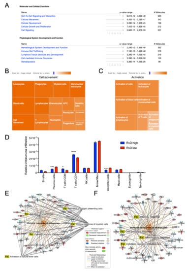 To corroborate this finding, IPA was used to evaluate molecular, cellular and biological functions affected in tumors with a high RvD score (Figure 1C). At molecular and cellular levels, DEG in high RvD tumors are significantly associated with the regulation of cell-to-cell signaling and interaction, and cellular movement and signaling. At the functional level, DEG modulate the development and actions of blood cells, immune cell trafficking and immune response (Figure 4A). Among the most significantly affected functions, cell movement (Figure 4B) and activation (Figure 4C) of several leukocyte subsets are characterized by positive z-scores, indicative of increased activity. To infer infiltrated intratumoral leukocyte levels, bulk RNA-seq gene expression data of tumors with high vs. low RvD scores were analyzed by CIBERSORT (Figure 1C) to predict the abundance of 10 major leukocyte subsets (B cells, plasma cells, CD8+ and CD4+, T cells, NK cells, monocytes/macrophages, dendritic cells, mast cells, eosinophils, neutrophils). CIBERSORT effectively determines the overall immune content in RNA-seq datasets when compared against other experimental methods []. Tumors with a high RvD score displayed increased levels of anti-tumor effectors such as CD4+, CD8+ T lymphocytes (Figure 4D), and decreased infiltration of plasma and dendritic cells. In addition, IPA of DEG indicated that high RvD score tumors showed increased activation of both myeloid and lymphoid cells (Figure 4E), resulting in enhanced cell-mediated, cytotoxic, and humoral responses induced by the increased levels of immune-inflammatory mediators (Figure 4F). Collectively, DEG analysis of bulk RNA-seq data suggest that high RvD scores recognize HNSC tumors with altered immune effector dynamics and anti-tumoral activation states.