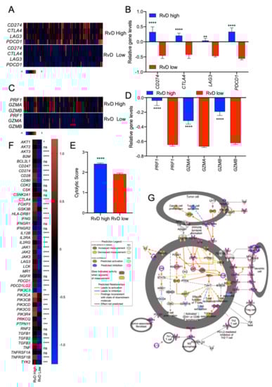 The gene expression levels of four key targets of immunotherapies [] CD274 (Programmed death-ligand 1, PD-L1), cytotoxic T-lymphocyte-associated protein 4 (CTLA4), lymphocyte activation gene-3 (LAG3) and Programmed cell death protein 1 (PDCD1, PD-1) were retrieved through the mRNA module of cBioPortal in RvD high and RvD low tumor samples and visualized as a heatmap for their RNA-seq V2 RSEM expression values. The mean expression for each gene was calculated and plotted as a histogram using GraphPad Prism 8.0. Patients with higher immunotherapy targets were defined as immunotherapy responders []. Extended analysis of immunotherapy targets was carried out, retrieving the expression levels of genes involved in the PD-1, PD-L1 cancer immunotherapy pathway of IPA (AKT1, AKT2, AKT3, B2M, BCL2L1, CD247, CD274, CD28, CD80, CDK2, CSK, CSNK2A1, CTLA4, FOXP3, GSK3B, HLA-DRB1, IFNG, IFNGR1, IFNGR2, IL12B, IL2RA, IL2RG, JAK1, JAK2, JAK3, LAG3, LCK, MR1, NGFR, PDCD1, PDCD1LG2, PIK3C3, PIK3CA, PIK3CB, PIK3CD, PIK3CG, PIK3R4, PRKCQ, PTPN11, RNF2, TGFB1, TGFB2, TGFB3, TNF, TNFRSF1A, TNFRSF1B and TYK2) reported as mRNA expression z-scores relative to diploid samples.