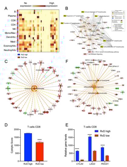 Higher RvD scores distinguish tumors with increased activation state in selected immune cells. (A) HNSC bulk RNA-seq were analyzed with the gene expression module of CIBERSORT to impute cell type specific expression profiles of 10 human immune subsets (LM10). The heatmap, generated with BioVinci, shows the gene expression profile of immune cells in tumors with high (blue rectangles) vs. low (red rectangles) RvD score. (B) IPA findings of biological functions (Fx) and canonical pathways (CP) associated with T lymphocytes activation and functions. (C) IPA findings of molecular network associated with increased lymphocyte cytotoxicity in RvD high score HNSC. (D) Cumulative CD8+ T cell cytolytic score in in high (n = 100) vs. low (n = 100) RvD score tumors. Data are shown as bars calculated on RSEM gene normalized values. ****, p < 0.0001, Student t test. (E) Mean gene expression levels (RSEM gene normalized values) of immunotherapy targets in CD8+ T cells stratified as high (n = 100) and low (n = 100) accordingly to their RvD score. ****, p < 0.0001, two-way ANOVA and Sidak’s multiple comparisons test. (F) IPA findings of biological functions associated with PMN activities.