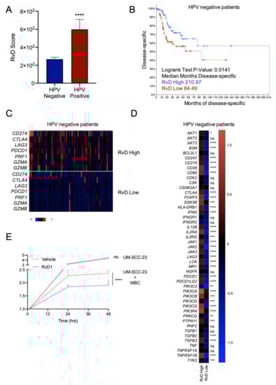 Higher RvD scores are associated with improved outcomes in HPV negative HNSC. (A) RvD score in HPV negative (n = 415) vs. HPV positive (n = 72) HNSC. **** p < 0.0001, Student t test. (B) Kaplan–Meier curve survival analysis of HPV negative HNSC patients stratified as high (n = 100) or low (n = 100) RvD score. Logrank test p-value and median months progression free are reported. (C) Heatmap of gene expression levels of immunotherapy targets and cytotoxic effectors in high (n = 100) vs. low (n = 100) RvD score in HPV negative HNSC patients. mRNA expression z-scores relative to diploid samples (RNA Seq V2 RSEM) are shown. Patients are reported in columns, genes in row. Color code is reported at the bottom of the panel. Blue: lower expression; red: higher expression. (D) Heatmap of gene expression levels of genes involved in the PD-1, PD-L1 cancer immunotherapy pathway (IPA). Shown are the mean expression levels of mRNA z-scores relative to diploid samples in HPV negative tumors with RvD high (n = 100) and RvD low (n = 100) score. * p < 0.05; ** < 0.01; *** p < 0.001; ****, p < 0.0001, two-way ANOVA and Sidak’s multiple comparisons test. (E) Growth of the HPV negative HNSC cell line UM-SCC-23 during co-incubations with purified blood-derived human leukocytes from n = 5 healthy donors exposed to RvD1 (10 nM) or vehicle control. Cell growth was monitored up to 48 h with an impedance-based real time cell analysis (ACEA). Target UM-SCC-23 cells treated with vehicle or RvD1 in the absence of leukocytes were used as control. Data are expressed as relative cell growth normalized at the start of treatments. ****, p < 0.0001, one-way ANOVA.