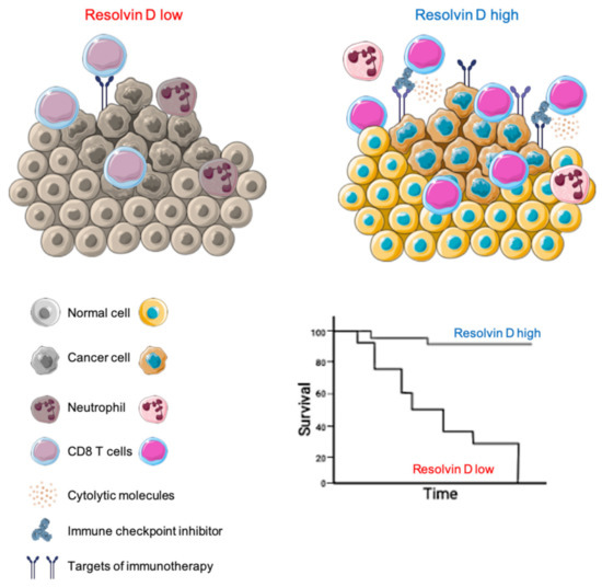 Here, we show that HNSC patients with an elevated RvD score showed extended survival, enhanced immune response, mainly driven by CD8+ T cells, and increased expression of immunotherapy targets, predicting a better response to ICI treatment (Figure 8). Therefore, an impairment in the RvD pathway (biosynthesis and signaling) could be detrimental in cancer, since it is linked to poorer prognosis and associated with a transcriptomic landscape predictive of weak anti-tumor immunity. These findings are in agreement with previous results, demonstrating that RvD supplementation reduces cancer growth in experimental models of tumorigenesis [,,,,].