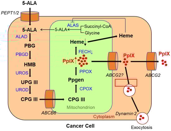 5-ALA is a natural amino acid and precursor of hemoglobin and chlorophyll []. The metabolic pathway of 5-ALA and the mechanism of PpIX accumulation in living cancer cells are shown in Figure 1. Exogenously administered 5-ALA is introduced into the cell via the action of transporters, such as peptide transporters (PEPTs) 1 and 2. Endogenous 5-ALA is produced from glycine and succinyl-CoA in the mitochondria via the enzymatic reaction of 5-ALA synthase (ALAS) []. Two 5-ALA molecules are condensed by ALA dehydratase (ALAD) to generate porphobilinogen (PBG) in the cytoplasm []. Four PBG molecules condense to produce hydroxymethylbilane (HMB) via the porphobilinogen deaminase (PBGD) reaction []. In living cancer cells, HMB is converted to uroporphyrinogen III (UPG III) by uroporphyrinogen III synthase (UROS) []. UPG III is converted to coproporphyrinogen III (CPG III) through decarboxylation of all acetate groups []. CPG III enters mitochondria via ATP-binding cassette transporter B6 (ABCB6). In the mitochondria, it is converted to protoporphyrinogen (Ppgen) and then to fluorescent PpIX []. PpIX is converted to non-fluorescent heme via the action of ferrochelatase (FECH), which inserts ferrous iron []. Moreover, heme negatively regulates ALAS activity in some ways, such as by repressing ALAS gene expression and degrading ALAS mRNA [,].