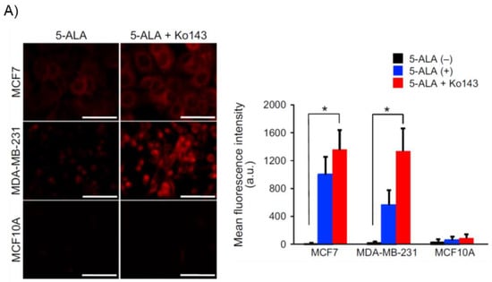 The activity of ABC superfamily G member 2 (ABCG2), which is used to discharge PpIX, also affects the PpIX FI (Figure 1) []. Figure 2 shows the effect of Ko143, a specific inhibitor of ABCG2, on PpIX FI in human breast cancer cells and xenografts []. The combined exposure of cultured MCF-7 and MDA-MB 231 cancer cells to 5-ALA and Ko143 boosts PpIX-FI compared to that in cultured non-cancer MCF10A cells, suggesting an improvement in the accuracy of 5-ALA PDD (Figure 2A) []. Increased FI attributed to the combined administration of 5-ALA and Ko143 was also observed in cancer cells acquired by fine needle aspiration in a murine tumor model (Figure 2B) []. In addition, clinically used ABCG2-interacting kinase inhibitors, such as lapatinib, gefitinib, sunitinib, and PD169316, have also been reported to increase 5-ALA induced PpIX-FI in triple-negative breast cancer cell lines [].