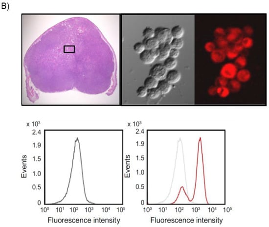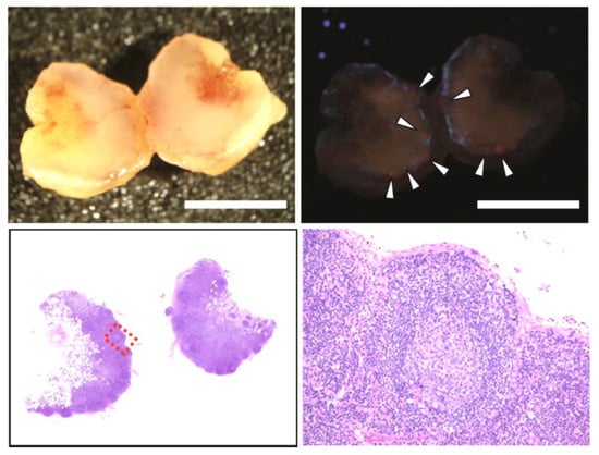 Another challenge is the non-specific accumulation of PpIX in nontumor tissues. PpIX fluorescence in non-neoplastic tissues has been reported in regions of inflammatory infiltration around HGG, reactive gliosis in patients receiving adjuvant therapy for recurrent HGG, and LNs accompanied by lymph follicles [,,,,]; peritumoral inflammatory conditions and elevated reactive mitotic activity could provide an explanation for the false-positive findings []. Some researchers have suggested that PpIX deposition in inflammatory lesions is associated with intracellular iron metabolism [,]; however, the precise mechanism is unknown. Figure 7 depicts an example of non-specific PpIX accumulation in the lymph follicle of an LN []. This LN was obtained from a patient with gastric cancer and cut in half. Although no metastatic carcinoma was observed in the LN, PpIX fluorescence signals were observed in round shapes, consistent with lymph follicles (arrowheads in Figure 7).