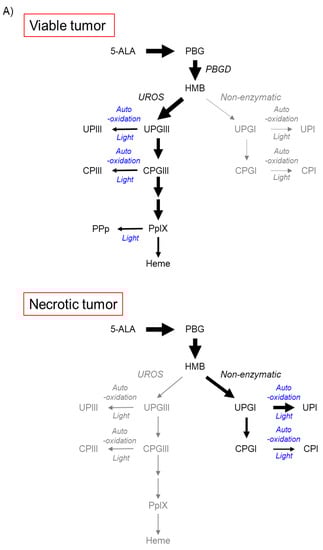 The metabolic pathway of 5-ALA in tumor necrosis in metastatic LN disease in patients with advanced esophageal cancer has recently been reported []. Tumor necrosis is a feature that often occurs in advanced solid tumors and has been proposed to be a sign of poor prognosis for various types of tumors []. In tumor necrosis, 5-ALA administration predominantly results in the production of uroporphyrinogen I (UPGI), but not UPGIII, via a non-enzymatic pathway, probably because of the lack of UROS enzyme activity (Figure 3A) [].