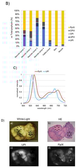 Figure 3B shows the analytical results of high-performance liquid chromatography in a subcutaneous squamous cell cancer murine model, where the abundance ratio of each porphyrin to the total dose of porphyrin was described []. UPI was found in necrotic tumors, whereas PpIX was detected principally in viable tumors, skin, and muscle tissues. UPI was readily produced from UPGI via autooxidation and/or photocatalytic reactions (Figure 3A) []. The fluorescence spectra of pure UPI and PpIX showed main peaks at approximately 620 nm and 635 nm, respectively (Figure 3C) []. Figure 3D shows the analytical results of metastatic squamous cancer with necrosis in a resected human LN. The locations indicated by arrows and arrowheads show viable and necrotic tumor lesions, respectively (a and b in Figure 3D) []. Unmixed fluorescence images of UPI and PpIX enabled the distinction of necrotic lesions from viable lesions (c and d in Figure 3D) []. Fluorescence peaks of tumor necrosis and living tumors were observed at 620 nm and 635 nm, respectively (data not shown) []. In summary, in viable tumor tissues, voluminous PpIX is produced in viable tumor tissues because the UPGIII/CPGIII axis of the heme synthesis pathway is active (upper panel of Figure 3A) [,,]. In contrast, in tumor necrosis, the spontaneous non-enzymatic route from HMB to UPGI precludes the one from HMB to UPGIII, leading to increased production of UPGI, a precursor of fluorescent UPI (lower graph of Figure 3A) [,,]. In the field of brain surgery, an association between false-positive 5-ALA-induced red fluorescence and radiation necrosis has been reported [,]. Although future studies are needed, UPI-derived red fluorescence may be a candidate for the origin of red fluorescence in radiation-associated necrosis.