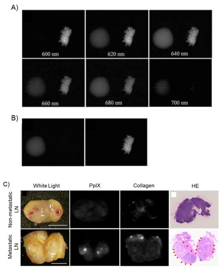 Spectral unmixing is a method to resolve the crosstalk among the fluorescence emission spectra of several materials [,]. This methodology presumes that the signal strength of each pixel in an obtained graphic can be shown as a linear combination of fluorescence spectra from multiple substances with known spectra [,]. An example of PpIX fluorescence in human colorectal cancer LN metastasis analyzed using the spectral unmixing method is shown (Figure 4) []. After fluorescence hyperspectral images of pure chemicals of PpIX and collagen type I from 480 to 700 nm at 20-nm intervals were acquired, the spectral unmixed images (Figure 4B) were computed and created based on the reference spectral images. Fluorescence spectral images of pure PpIX (left in each graphic of Figure 4A) and collagen type I (right in each graphic of Figure 4A) obtained at 600–700 nm at 20-nm intervals are shown for reference []. PpIX predominantly radiated fluorescence in the range 620–680 nm and had the strongest signal intensity at 640 nm (Figure 4A) []. Collagen also radiates strong fluorescence in the range of 600–680 nm (Figure 4A) []. Thus, collagen fluorescence overlaps with PpIX fluorescence when assessed using conventional band-pass filtering []. However, the PpIX signal was differentially isolated from collagen one in the computed unmixed images (Figure 4B) []. Assuming that the fluorescent component of human colorectal cancer metastatic LNs consists of the sum of PpIX fluorescence and collagen fluorescence, spectral unmixed images were built based on the reference spectral images of pure PpIX and collagen (Figure 4C) []. In non-metastatic (upper panels of Figure 4C) and metastatic (lower panels of Figure 4C) LNs cut in half, PpIX unmixed fluorescence was not observed in non-metastatic LNs, but an unmixed PpIX fluorescence signal was observed in metastatic foci []. Although the method is relatively time-consuming for obtaining hyperspectral images, the spectral unmixing method is a modified version of the spectroscopic analysis procedure and provides semi-quantitative fluorescence images of PPIX and autofluorescent substances [].