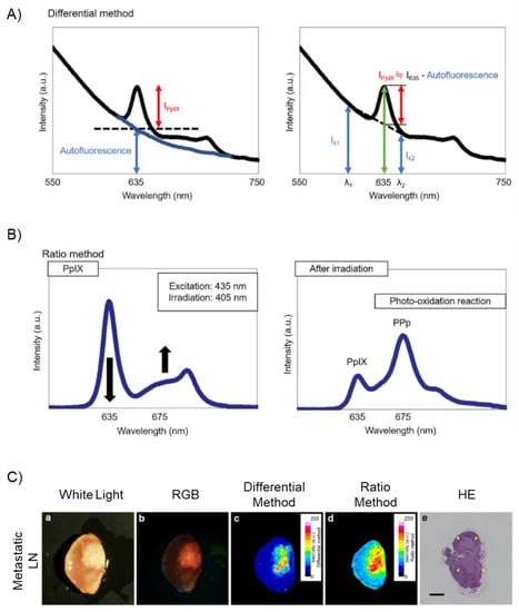 To reduce the negative effects of autofluorescence, the photooxidation phenomenon of PpIX can also be used to specifically detect PpIX fluorescence, which is called the ratio method [,]. The ratio method depends on the photo-conversion of PpIX to photo-protoporphyrin (PPp) by blue-light irradiation []. Upon photoirradiation, PpIX is oxidatively converted to PPp (upper panel of Figure 3A); PPp has a spectral peak at 675 nm and PpIX has a peak at 635 nm []. Continuous 405 nm light irradiation of tumor tissue increased the PPp spectral peak at 675 nm and decreased the PpIX spectral peak at 635 nm (left panel of Figure 5B) []. Therefore, the intensity ratio of PpIX at 675 and 635 nm can be increased by photoirradiation (right panel of Figure 5B) []. The increase in the 675/635 nm intensity ratio after light irradiation shows the presence of PpIX []. Although the ratio method is effective in removing the effect of autofluorescence, it requires light irradiation for photo-conversion, and the measurement takes anywhere between several tens of seconds to several minutes.