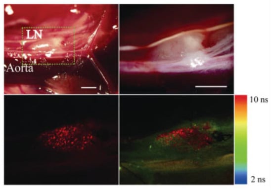 One potential tool for specifically detecting PpIX in autofluorescent tissues is time-resolved fluorescence measurement. The fluorescence lifetime is the mean temporal difference between the excitation of fluorescent molecules and their fluorescence emission []. In 2009, FLIM analysis of PpIX was performed in a mouse colorectal cancer LN metastasis model after 5-ALA administration []; Figure 6 shows the result of in vivo FLIM analysis of LN metastasis in a mouse []. The boxed field of a metastatic LN in the peritoneal cavity (upper left graph of Figure 6: white-light image) was observed using FLIM. An enlarged illustration of the boxed field (upper right graph of Figure 6: white light image), confocal FI image (lower left graphic; excitation: 405 nm, emission: 600–660 nm), and the corresponding FLIM image (lower right graphic; excitation: 405 nm, emission: >420 nm) are depicted []. The metastatic lesion in the LN, invisible in white-light imaging, can be visualized by sensing the differences between the lifetimes of PpIX and autofluorescent molecules []. The fluorescence lifetime of the metastatic carcinoma was found to be longer than that of the background non-metastatic region; the fluorescence lifetime of PpIX was reported to be 16.4 ns, whereas the autofluorescence lifetime of mouse and human tissues is approximately 0.8–2 ns [,,]. Therefore, FLIM analysis can specifically discriminate PpIX molecules from other autofluorescent molecules in the tissues. According to recent reports, PpIX lifetime imaging has the potential to render tumor detection highly sensitive and distinguish tissues emitting weak PpIX fluorescence, such as infiltrated areas of LGGs, from background non-tumor tissues [,].
