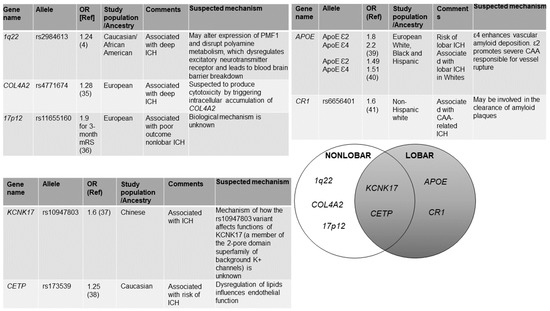 Genetic variants associated with primary intracerebral hemorrhage from genome wide association studies (GWAS). We identified references for this review by searching PubMed from January 2010, to December 2021, using combinations of the terms: “intracerebral hemorrhage” and “GWAS”. We restricted our search to articles published in English. We also found relevant papers by searching authors. We selected material for inclusion on the basis of quality and relevance. In cases of multiple positive reports, only the initial positive study is cited [4,35,36,37,38,39,40,41].