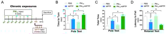 Long-term exposure to PM10 enhanced the severity of behavioral deficits in MPTP-treated mice. (A) Experimental schematic describing long-term exposure to PM10 (5 mg/kg) for 8 weeks and the MPTP-induced mouse model of Parkinson’s disease used to assess motor impairments in mice. (B–D) Motor impairment was assessed by the pole test (B,C) and rotarod test (D) 1 week post-MPTP challenge. The data are expressed as the mean ± SEM (n = 5 per group). * p < 0.05. ns indicates no significant differences among the groups.