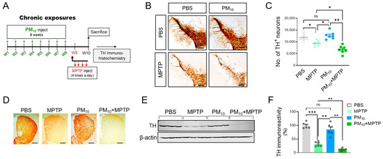 Next, we analyzed whether PM10 exerts neurotoxic effects on DA neurons in PD. To test this hypothesis, we assessed tyrosine hydroxylase (TH) immunoreactivity to identify dopaminergic neurons in MPTP mice following chronic PM10 exposure (Figure 2A). As expected, compared to the PBS injection, MPTP administration led to a significant reduction in TH immunoreactivity in the pars compacta of the substantia nigra (SNpc) in the mice (Figure 2B,C). Importantly, the chronical PM10-exposed mice displayed a significant reduction in the TH-positive neurons of the SNpc in response to the MPTP challenge. There was no clear change in TH immunoreactivity in mice exposed to only PM10, suggesting that PM10 exposure (5 mg/kg) for 8 weeks alone does not induce notable DA neuron death. Next, we assessed the survival of DA neurons in the corpus striatum. Similar to the results from SNpc, PM10 exposure resulted in a decrease in TH immunoreactivity in the striatum of the MPTP-treated mice (Figure 2D). The neurotoxic effects of chronic PM10 exposure on MPTP-induced neurodegeneration were confirmed by western blotting analysis of the corpus striatum tissues (Figure 2E,F).