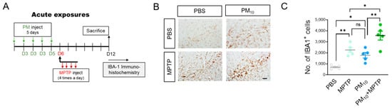 Despite numerous possibilities for how air pollution is linked to the brain, the pathologic effects of ambient particulate matter on neurodegeneration have been largely overlooked. Interestingly, a recent in vitro study demonstrated that diesel exhaust particles caused enhanced microglial activation, which subsequently induced selective damage to in vitro DA neurons [17]. Here, we hypothesized that PM10 exposure may be linked to microglia that accelerate the progression of Parkinson’s disease. To test this hypothesis, we exposed mice to PM10 (5 mg/kg) for a short period of time (5 days) and then evaluated microglial activation in the SNpc of mice by staining with ionized calcium-binding adaptor molecule 1 (IBA1), a marker of activated microglia (Figure 3A). PM10 exposure caused a significant increase in the number of cells positive for IBA1 compared to the control mice (Figure 3B,C). Furthermore, mice challenged with MPTP displayed enhanced IBA1+ cells in the substantia nigra compared to the PBS-treated control mice. Importantly, we observed that, following the MPTP challenge, acute PM10-exposed mice displayed enhanced IBA+ cells compared to mice exposed to only PM10 or treated to only MPTP.