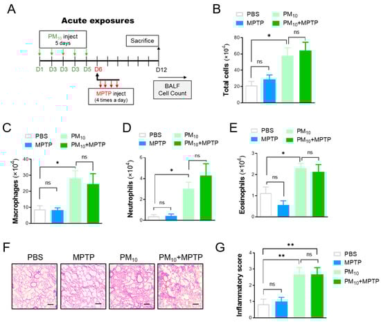 Short-term exposure to PM10 induced pulmonary inflammation in mice. (A) Experimental schematic describing short-term exposure to PM10 (5 mg/kg) for 5 days and PD mice following MPTP challenge to evaluate lung inflammation. (B–E) Bronchoalveolar large (BAL) fluid was analyzed by counting the total number of inflammatory cells (B), macrophages (C), neutrophils (D), and eosinophils (E) in mice. (F,G) Representative images of lung tissues stained with hematoxylin and eosin (H&E). The scale bar is 50 μm. The data are expressed as the mean ± SEM (n = 5–8 per group). * p < 0.05; ** p < 0.01. ns indicates no significant differences among the groups.