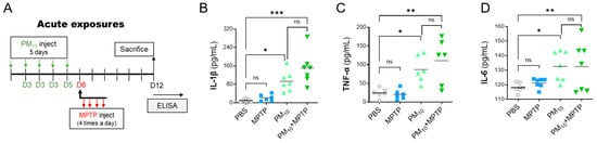 Short-term exposure to PM10 triggered systemic inflammation in mice. (A) Experimental schematic describing short-term exposure to PM10 (5 mg/kg) for 5 days and PD mice following MPTP challenge to investigate systemic inflammation. (B–D) The levels of proinflammatory cytokines in the serum of mice were analyzed by ELISA. The investigated cytokines were IL-1β, TNF-α, nd IL-6. The data are expressed as the mean ± SEM (n = 5–7 per group). * p < 0.05; ** p < 0.01; *** p < 0.001. ns indicates no significant differences among the groups.