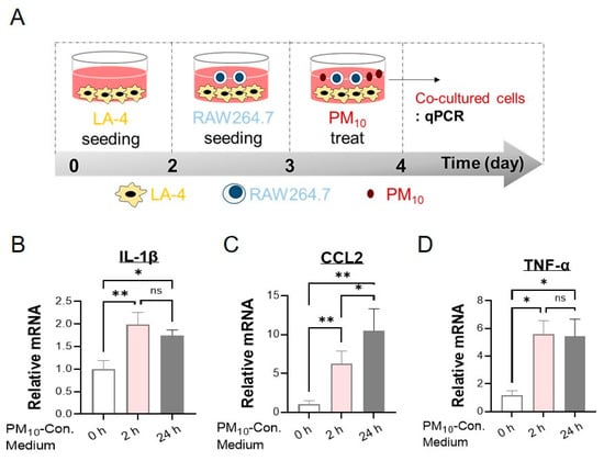 Inflammatory effect of PM10 in cocultured LA-4/RAW264.7 cells. (A) In vitro schematic displaying the coculture system with lung epithelial LA-4 cells and macrophages against PM10 stimulation. PM10 (50 μg/mL) was applied to cocultured cells for 0, 2, and 24 h. (B–D) Real-time qPCR analysis was used to measure the mRNA levels of proinflammatory cytokines and chemokines, including IL-1β (B), CCL2 (C), and TNF-α (D), in LA-4/RAW264.7 cells. Data are presented as the mean ± SEM of five independent experimental repeats. The relative level of proinflammatory cytokines was normalized to that of β2-microglobulin (B2M) and calculated as the fold change compared to those in the PBS-treated group. * p < 0.05; ** p < 0.01. ns = no significant difference among the groups.