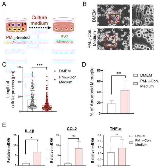 Microglial activation induced by PM10-conditioned medium from cocultured LA-4/RAW264.7 cells. (A) Experimental schematic describing the application of PM10-conditioned medium from LA-4/RAW264.7 cells cocultured into BV2 microglial cells. The culture medium was obtained from cocultured LA-4/RAW264.7 after 24 h of PM10 treatment (50 μg/mL). The PM10-conditioned medium was then applied to BV2 cells for 24 h. (B) Morphological changes in BV2 cells following the application of PM10-conditioned medium were observed under a phase-contrast microscope (shown at 400× magnification). (C) Cellular processes of microglial BV2 cells were measured with ImageJ using a NeuronJ plugin. The path length from the soma to the point where the process terminates was calculated and counted using the neurite tracing method. (D) Activated microglia showing an amoeboid shape were counted under a phase-contrast microscope. The results are expressed as the percentage of activated cells. (E) Real-time qPCR analysis was performed to measure the mRNA levels of proinflammatory cytokines and chemokines, such as IL-1β, CCL2, and TNF-α, in PM10-conditioned medium-stimulated BV2 microglia. The data are expressed as the mean ± SEM (n = 4–5 per group). * p < 0.05; ** p < 0.01; *** p < 0.001. ns = no significant difference among the groups.