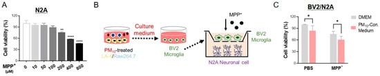 In a coculture of microglia and neurons, N2A cells were grown in the bottom of wells. BV2 cells were grown in culture inserts (pore size 0.4 μm; Corning, New York, NY, USA) and activated with PM10-conditioned medium as described above. Then, these BV2 in culture inserts were placed on top of the N2A-containing wells. MPP+ (Sigma, St. Louis, MO, USA) was applied to the culture bottom for 24 h. To assess neuronal toxicity against MPP+, MTT (5 mg/mL; Sigma, St. Louis, MO, USA) was added. After incubating for 4 h, the formazan crystals were solubilized with SDS solution (10% SDS and 0.01 M HCl). Absorbance was detected using a multi-plate reader at a wavelength of 570 nm (A570).
