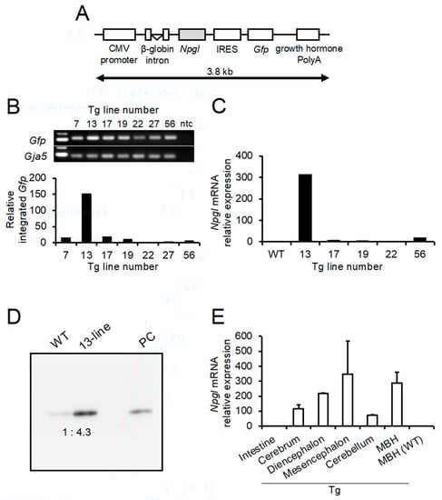 Construction of the transgene is shown in Figure 1A. The ubiquitous cytomegalovirus (CMV) promoter was used to regulate the expression of Npgl. The transgene solution was microinjected into the pronuclei of fertilized eggs (ICR background), and the eggs were transferred into fallopian tubes of pseudo-pregnant female mice. As a result, 82 F0 mice were obtained. Genotyping revealed that the transgene was integrated into the genome of seven mice. The individual identification numbers were 7, 13, 17, 19, 22, 27, and 56 (Figure 1B). Quantitative analysis of integrated green fluorescent protein (Gfp) genes showed that integrated copies of the transgene were highest in the 13-line (Figure 1B). However, the amount of integrated transgene is not proportional to its expression level because the exogenous transgene is affected by the site of chromosomal integration [,]. Therefore, we analyzed the expression of Npgl mRNA in the mediobasal hypothalamus (MBH). The results show that the 13-line Npgl Tg mouse also had the highest level of Npgl mRNA expression among the five lines (Figure 1C). Furthermore, western blot analysis revealed that the mature NPGL protein was also overexpressed in the hypothalamus 13-line of Npgl Tg mice, and the levels were approximately 4.3 times higher than those in wild-type (WT) mice (Figure 1D). Thus, we mainly used the 13-line Npgl Tg mice for subsequent experiments. In addition, we used the 17-line Npgl Tg mice to confirm the phenotype as a different line.