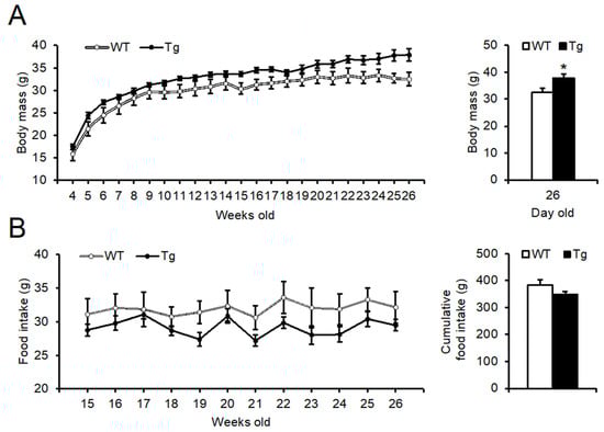 To determine the effects of Npgl overexpression on the central nervous system of mice, we assessed body mass, food intake, and body composition. Although two-way repeated measures ANOVA revealed no significant effect of Npgl overexpression on body mass, that of Npgl Tg mice was higher than that of WT mice at 26 weeks of age (Figure 2A). WT and Npgl Tg mice showed similar food intake from 15 to 26 weeks of age (Figure 2B).
